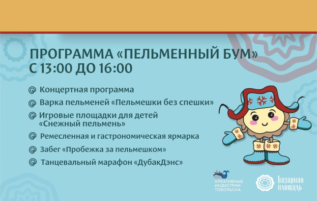 Администрация Тобольска приглашает товаропроизводителей — индивидуальных предпринимателей и руководителей юридических лиц — к участию в ярмарке «Пельменный съест», которая состоится 15 февраля с 13:00 до 16:00 на территории Базарной площади.