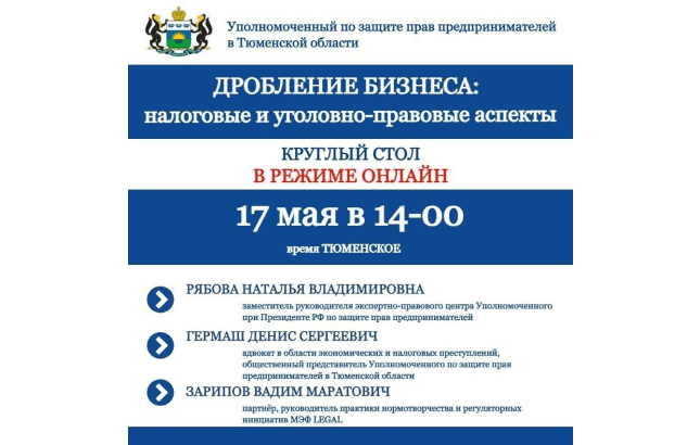 17 мая 2024 года в 14:00 (время тюменское) в режиме ВКС приглашаем принять участие в работе круглого стола на тему: "Дробление бизнеса: налоговые и уголовно-правовые аспекты".