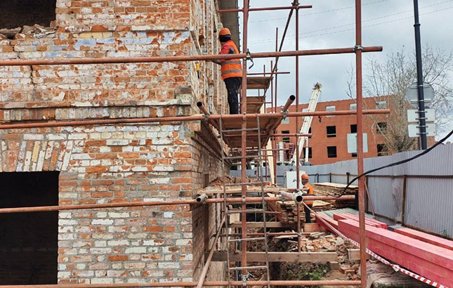 Бережно восстанавливают кирпичную кладку дворового фасада, используя оригинальный кирпич.