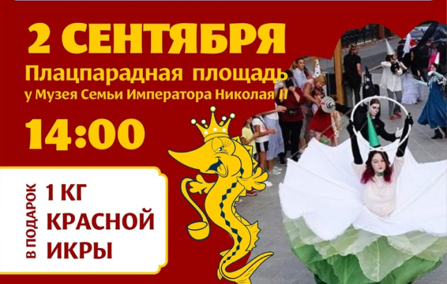 А кто-то - самый удачливый - получит целый килограмм красной икры! Но кто будет счастливчиком, мы узнаем только в финале шествия - на Базарной площади. Встречаемся в 14:00 на плацпарадной площади у Музея Семьи Императора Николая II.