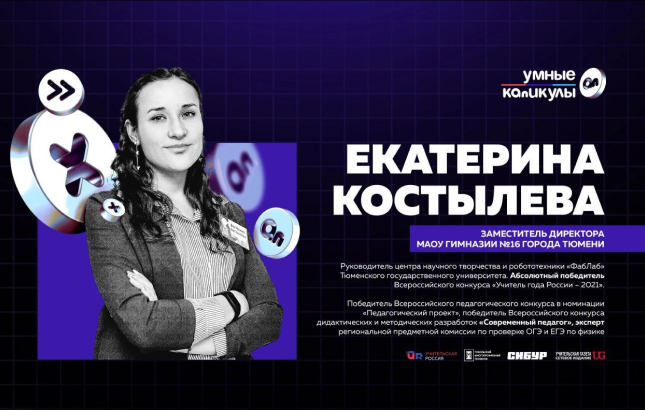 Костылева Екатерина Сергеевна, заместитель директора гимназии №16 города Тюмени, руководитель центра научного творчества и робототехники «ФабЛаб» ТГУ. Абсолютный победитель Всероссийского конкурса «Учитель года России – 2021», победитель Всероссийского педагогического конкурса в номинации «Педагогический проект», победитель Всероссийского конкурса дидактических и методических разработок «Современный педагог», эксперт региональной предметной комиссии по проверке ОГЭ и ЕГЭ по физике.