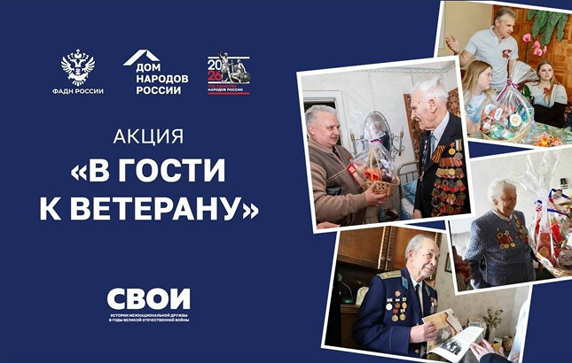 Дом народов России проводит Всероссийскую акцию «В гости к ветерану» в рамках Года единства народов России. Акция проводится с 15 апреля по 10 мая по всей стране. Многонациональный народ России посетит ветеранов Великой Отечественной войны, жителей блокадного Ленинграда, детей войны и бывших узников фашистских концлагерей.